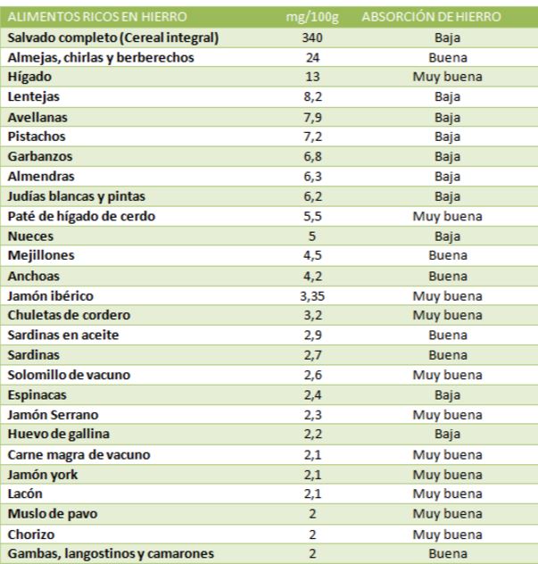 deficiencias de hierro e incluir en ella alguno de los alimentos anteriores.