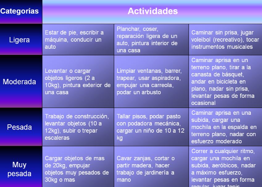 de 60 minutos de actividad muy intensa o bien 120 minutos de actividad