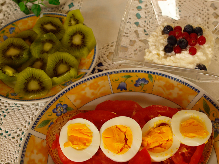 grosellas, kiwi, una rebanada de pan de centeno con tomate y un huevo cocido.