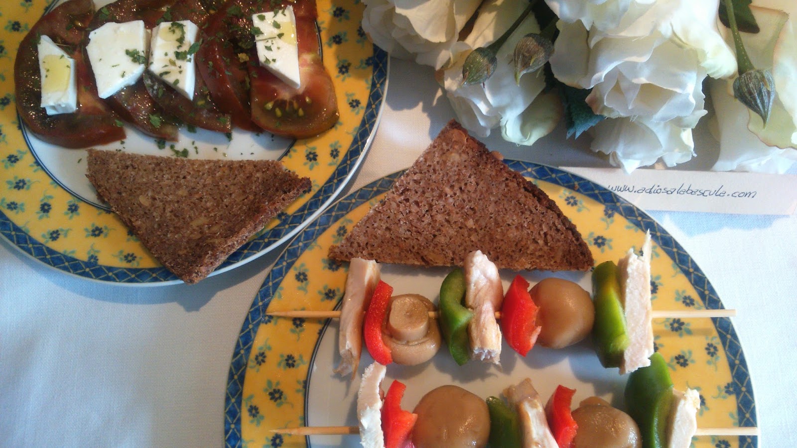 champiñones, tomatitos cherry. Hacerlo en una plancha, ir girando la brocheta