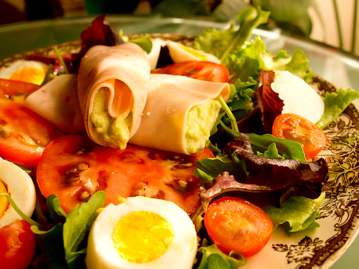 Ensalada con rollitos de pavo y aguacate.