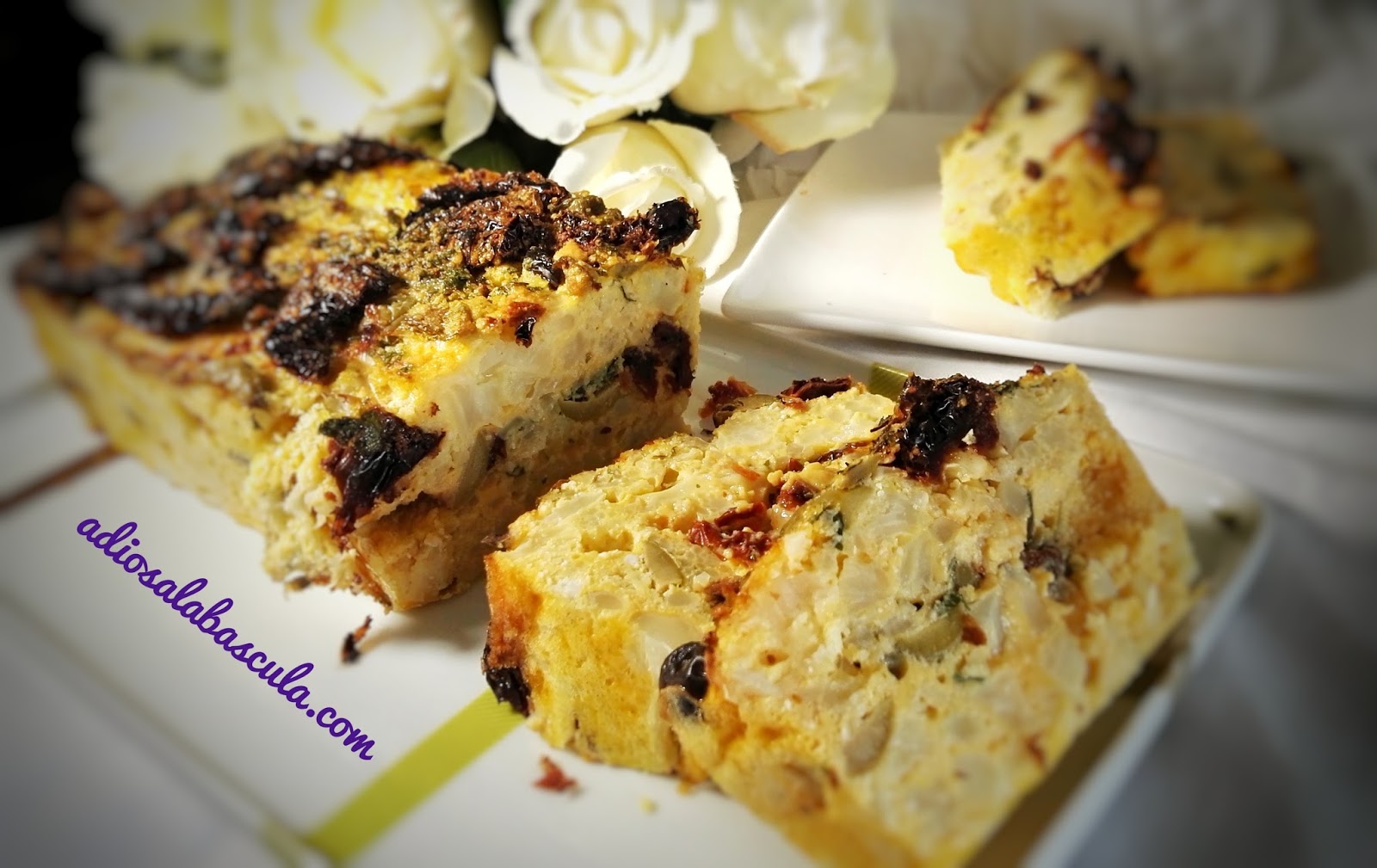 coliflor, una capa de tomates secos partidos en trozos, una capa de aceitunas y